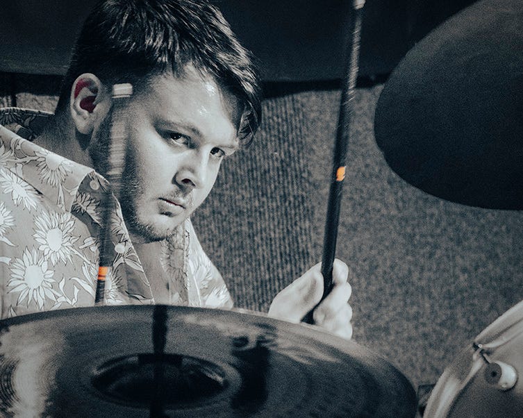 Even with their amps, the other players in the band are nearly overpowered by the cannonfire rolls and frenetic fills provided by Maycen Miser. Maycen’s drumming style seems a lot like Dave Grohl’s in it’s modernity, with high hands and bent elbows and trembling drums, but at other times he shows elements of big band drummers like Buddy Rich, where it’s all motion from the wrists and shoulders, in a more flat attack on the kit.