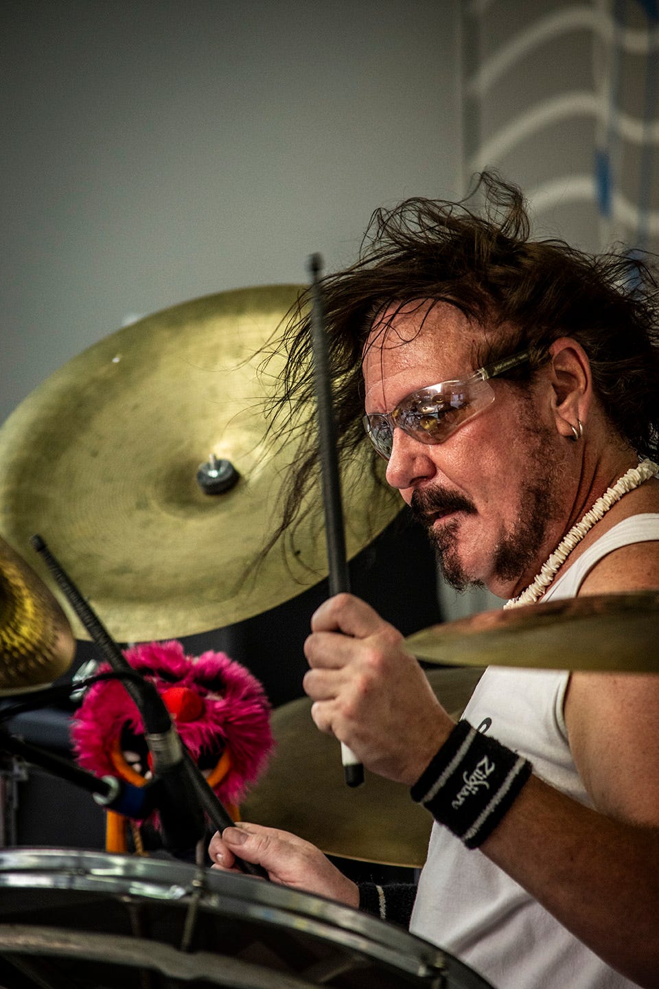 Perhaps it’s appropriate that I saved The Animal, Chris Hunt, drummer, for last. While Larissa Brown is up front commanding attention, Chris is in back like a wild man, lifting his sticks up high and crashing them down on his drums during some of Hellen Bach’s heavier rock numbers, while twirling his sticks and bobbing his head in whimsical fashion on dancier tracks. He stands up during quick breaks and tempo changes, then returns to his throne with a flourish without missing a beat. Chris is one of the more entertaining drummers I’ve seen in a long time.