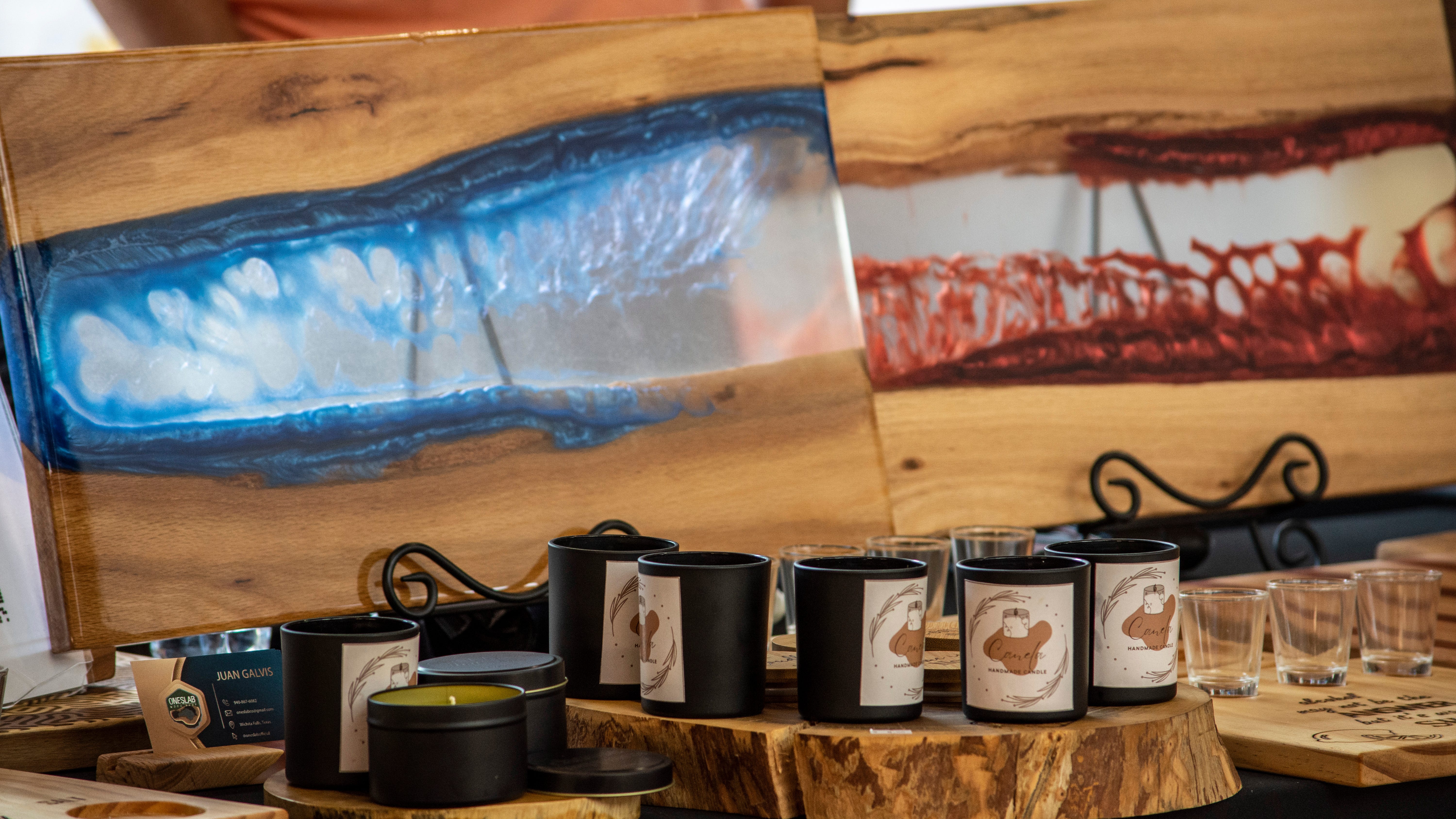 I stopped to look at the products offered by OneSlab Wood Shop and I was pretty impressed. They make serving trays and cutting boards out of wood and resin, using an artistic technique that I hadn’t seen before. My photos don’t do them justice. You could hang them on the wall as art.