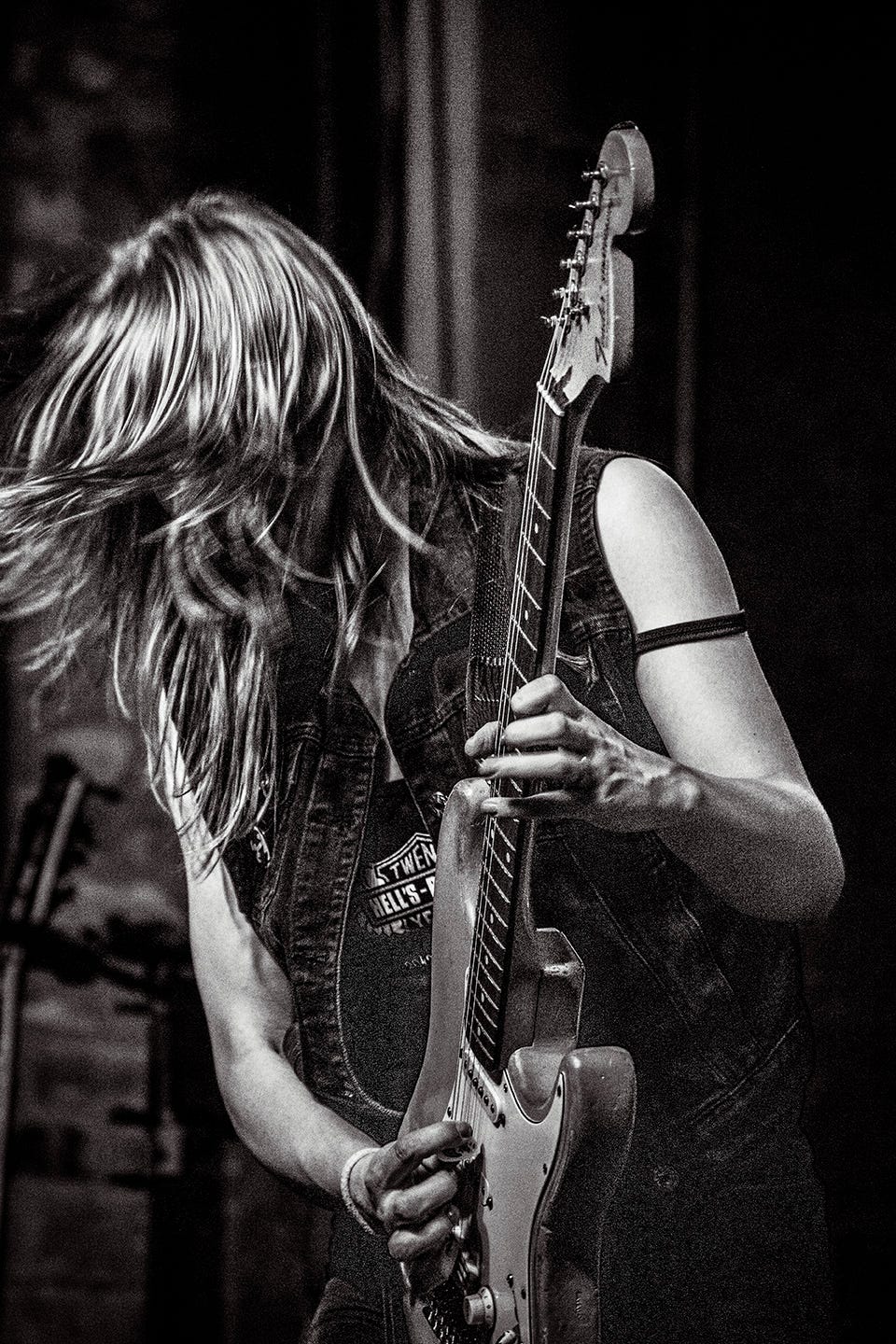 Lead and rhythm guitarist Sofie Abrams told me she met Kevin on the road. In Idaho, she had her own band, and met Kevin and Ratchet Dolls when they were out on tour together, their bands playing some of the same bills. They maintained a long distance relationship between Idaho and Texas for a time, but eventually she moved to San Antonio and the two joined forces in Ratchet Dolls. She is an amazing musician with killer rock chops.