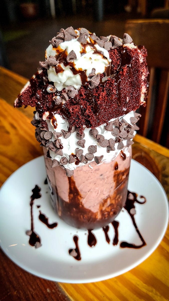 My friends, that is a “Reba” handmade milkshake. Blended ice cream and red velvet cake with frosting, chocolate sauce, chocolate chips, whipped cream, and a slice of red velvet cake delicately perched atop a mason jar.