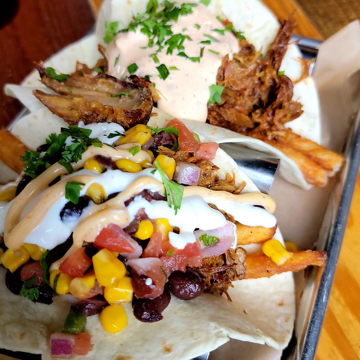 The Cali comes with their Dr. Pepper pulled pork, fries, black bean corn relish, lime sour cream, and sriracha mayo, and it is incredibly good. The Oki was my favorite. Dr. Pepper pulled pork, fries, kimchi bacon sauce, and cilantro.