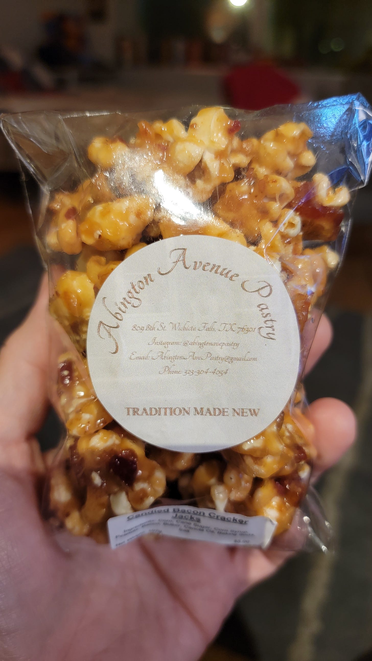 Leigh also sold me something my doctor says I’m not supposed to have — sugar. Specifically, Candied Bacon Cracker Jacks.